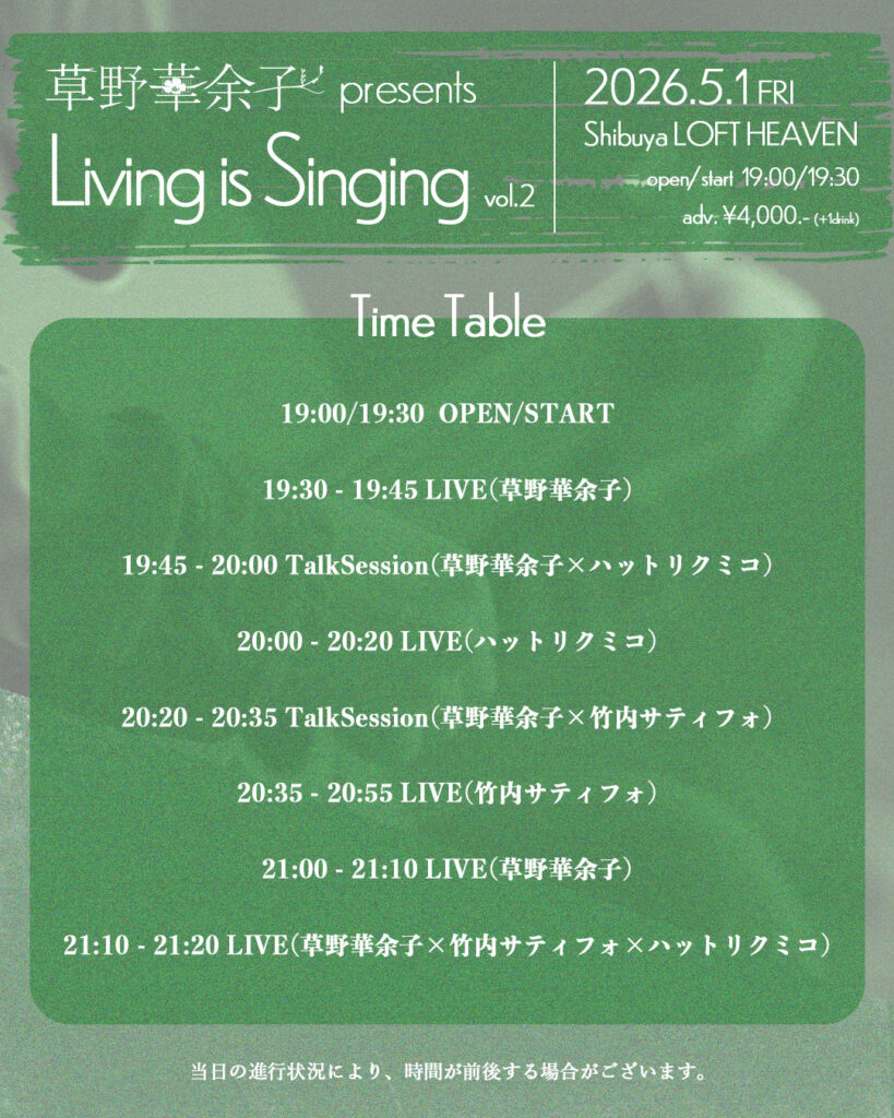 草野華余子 presents『Living is Singing -vol.2-』の開催が決定しました!